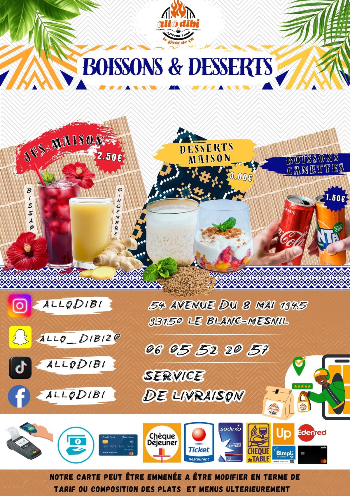 Allô Dibi est un restaurant africain situé au Blanc-Mesnil, spécialisé dans les grillades au feu de bois et les spécialités africaines. Nous proposons du dibi, poulet braisé, brochettes, attiéké, garba, accompagnements maison et desserts. Notre restaurant accueille ses clients sur place, propose la vente à emporter et la livraison. Toutes nos viandes sont fraîches et préparées chaque jour.
